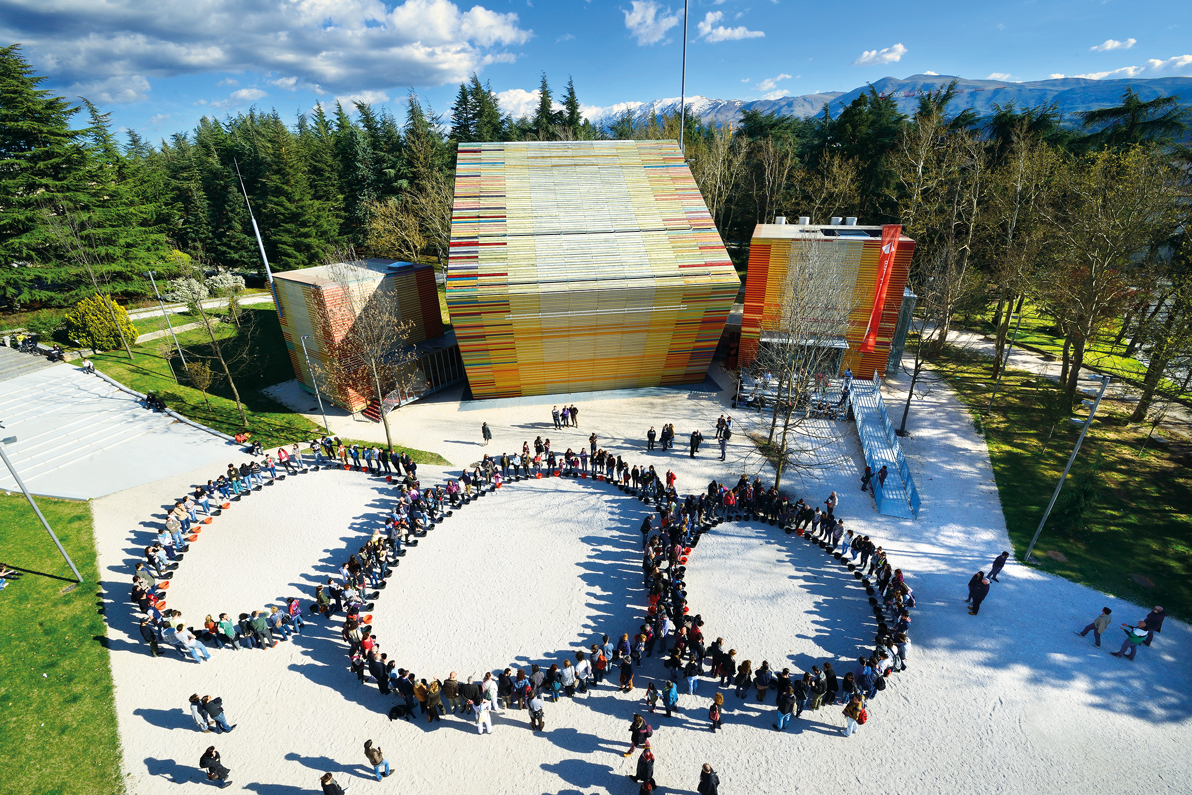 La mappatura e la mostra si tradurranno in alleanze concrete durante il Forum demopratico, in programma il 29 e 30 maggio presso Palazzo Spaventa. Il Forum sarà un vero e proprio laboratorio civico e uno spazio di dialogo per definire nuove forme di governance culturale e immaginare il futuro della città. A questo si affianca un capillare Public Program che animerà l’intero territorio per tutto l’anno con workshop, performance e pratiche partecipative, includendo un fondamentale lavoro di misurazione dell’impatto economico, sociale e culturale generato. Il profondo legame con la città si riflette anche nel concept grafico del progetto: la forma iconica del Terzo Paradiso è stata reinterpretata attraverso 99 punti, un omaggio alla storia e alla leggenda dei 99 castelli che fondarono L’Aquila nel XIII secolo. Questi punti diventano oggi la metafora visiva di una comunità contemporanea attiva e partecipata, mentre i colori scelti riprendono quelli ufficiali dell’Aquila Capitale italiana della Cultura 2026, unendo memoria storica e visione futura. Un progetto in continuità con il Terzo Paradiso realizzato dallo stesso Pistoletto nel 2014, nel piazzale di fronte l’Auditorium del Parco. Il Terzo Paradiso non rappresenta dunque un punto di arrivo, ma una sintesi visibile delle relazioni costruite e un passaggio verso nuove forme di convivenza e sviluppo sostenibile.